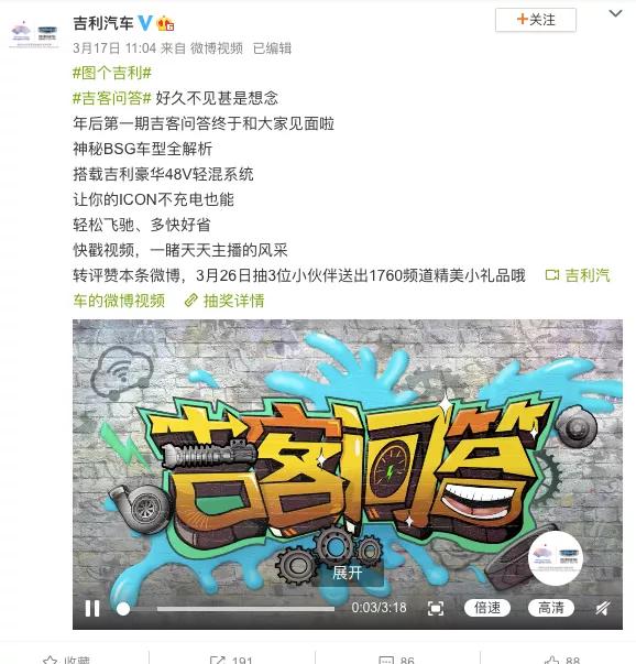 我们可以看到,截止目前发文的24小时内 @吉利汽车 在微博有关的博文声量达到了15万+。