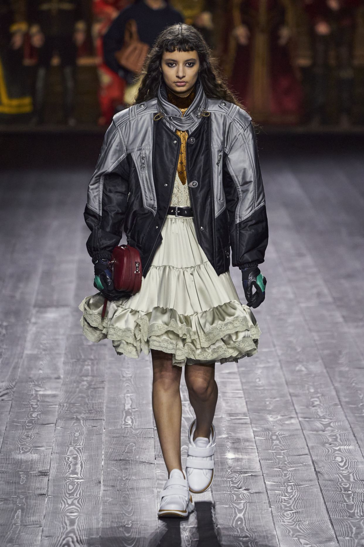像LV这样搭配娃娃装式的层叠丝缎短裙,打造的是一个末来感十足的活力少女feel。